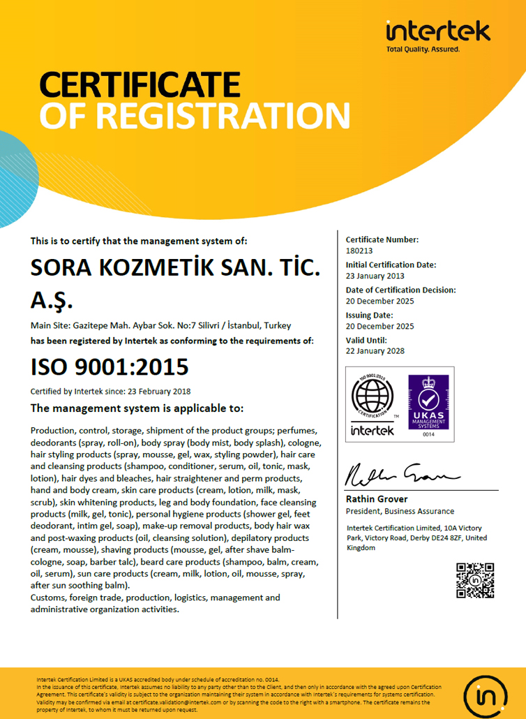 With a view to its international sales and marketing vision, participation at fairs such as Cosmoprof Bologna, Cosmeeting Paris, Hair & Beauty Frankfurt, Beautyworld Dubai and Cosmoprof Hong Kong are regularly included on the agenda of Sora. Moreover, membership to key portals such as alibaba.com, turkishexporters.com, add serious value to the supply chain of Sora, which bears all major international quality management certifications within its infrastructure.
